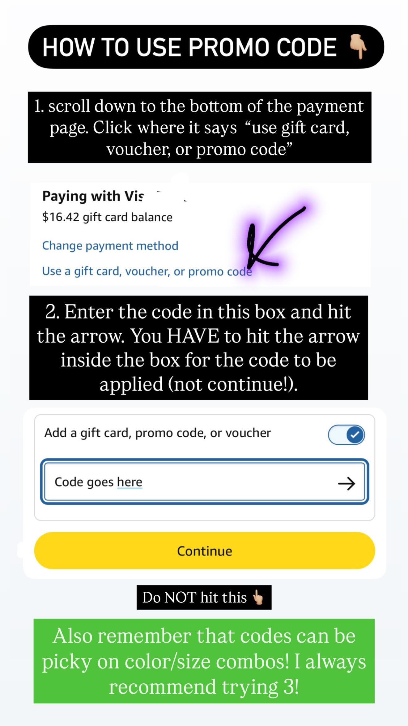 Most of the times- I will provide the promo link to the item under the photo. You click that link and it will open up to Amazon showing you certain colors and sizes that are included on this promo. You HAVE to pick one of those on the listing for the code to be applied. It doesn't work on all. After you add the item to your cart, go all the way to checkout to see the code applied (this is your last step before hitting purchase).